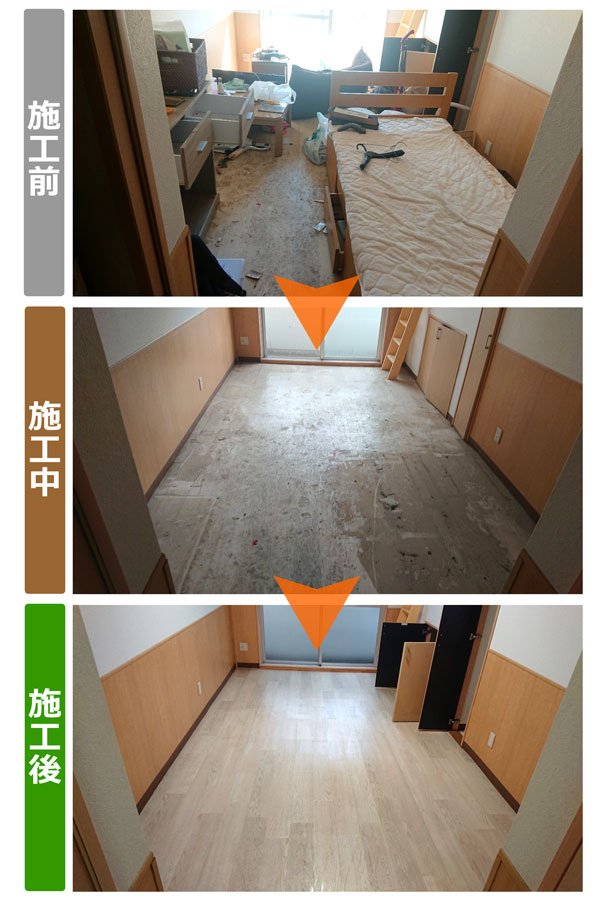 | 施工内容 | 床上浸水の賃貸アパート清掃 |