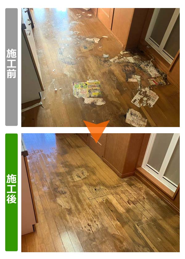 | 施工内容 | 引越し退去後の床掃除 (床にこびりついたチラシや雑誌を除去) |